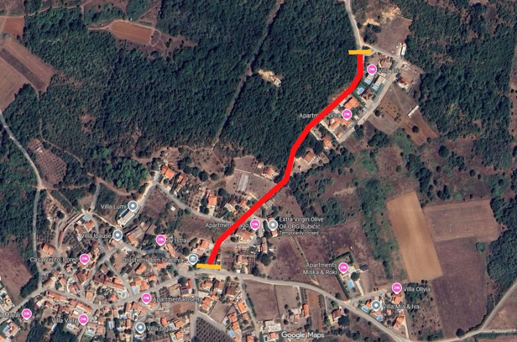 Obavještavamo da će zbog izvođenja radova na izgradnji kanalizacijske mreže naselja Dračevac, od srijede 01.10.2025. do petka 05.12.2025. godine biti zatvorena cesta od raskrižja kod društvenog doma u Dračevcu prema naselju Radmani, sukladno situaciji u privitku. Školski autobus će koristi alternativni pravac Dračevac – Starići – Poreč.