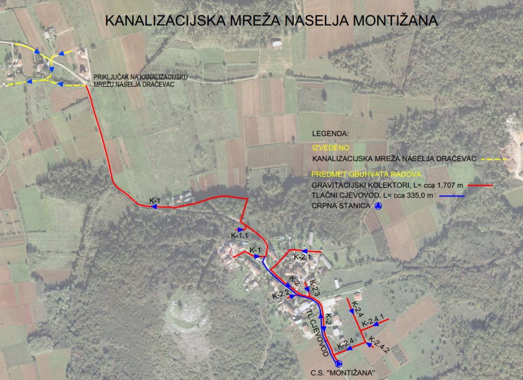 U sklopu ugovorenih radova obuhvaćena je izgradnja gravitacijskih kolektora ukupne duljine 1.707 metara i tlačni vod ukupne duljine 335 metara, te gradnja crpne stanice Montižana kapaciteta crpljenja od 6 l/s. Projektirani kolektori će preko planiranih 60 kućnih priključaka prikupljati sanitarno – potrošne otpadne vode iz naselja Montižana i odvoditi na novoizgrađeni sustav javne odvodnje naselja Dračevac.